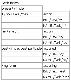 ac·tion [action actions actioned actioning] noun, verb BrE [ˈækʃn] NAmE [ˈækʃn]