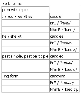 cad·die [caddie caddies caddied caddying] (also caddy)noun, verb BrE [ˈkædi] NAmE [ˈkædi] noun (pl. cad·dies)(in ↑golf) a person who helps a player by carrying his or her ↑clubs and equipment during a game Word Origin: mid 17th cent. (originally Scots): from French ↑cadet. The original term denoted a gentleman who joined the army without a commission, intending to learn the profession and follow a military career, later coming to mean ‘odd-job man’. The current sense dates from the late 18th cent. verb (cad·dies, caddy·ing, cad·died, cad·died)intransitive to act as a ↑caddie in the game of ↑golf Verb forms: Word Origin: mid 17th cent. (originally Scots): from French ↑cadet. The original term denoted a gentleman who joined the army without a commission, intending to learn the profession and follow a military career, later coming to mean ‘odd-job man’. The current sense dates from the late 18th cent. See also: ↑caddy