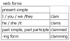 clam [clam clams clammed clamming] BrE [klæm] NAmE [klæm] noun  a ↑shellfish that can be eaten. It has a shell in two parts that can open and close •clam chowder/soup •The moment I mentioned the children he closed up like a clam (= became silent and refused to discuss the topic). Word Origin: early 16th cent.: apparently from earlier clam ‘a clamp’, from Old English clam, clamm ‘a bond or bondage’, of Germanic origin; related to Dutch klemme, German Klemme, also to ↑clamp. Derived: ↑clam up verb (-mm-) Verb forms: Word Origin: early 16th cent.: apparently from earlier clam ‘a clamp’, from Old English clam, clamm ‘a bond or bondage’, of Germanic origin; related to Dutch klemme, German Klemme, also to ↑clamp.