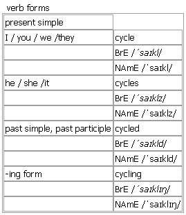 cycle AW [cycle cycles cycled cycling] noun, verb BrE [ˈsaɪkl] NAmE [ˈsaɪkl] noun 1. a bicycle or motorcycle • We went for a cycle ride on Sunday. •a cycle route/track see also ↑bike 2. the fact of a series of events being repeated many times, always in the same order •the cycle of the seasons • They could not break the cycle of harvest failure, food shortage, price increase and misery. see also ↑life cycle 3. a complete set or series, for example of movements in a machine •eight cycles per second •the rinse cycle (= in a washing machine) Word Origin: late Middle English: from Old French, from late Latin cyclus, from Greek kuklos ‘circle’. Thesaurus: cycle noun C •This cycle of events continually repeats itself. pattern • • rhythm • a/an regular/irregular cycle/pattern/rhythm a natural cycle/rhythm break a cycle/pattern/rhythm the cycle/rhythm of the seasons Cycle, pattern or rhythm? Pattern is used especially to talk about people's work and behaviour; cycle is used especially to talk about events in the natural world; rhythm is used especially to talk about how people's bodies adapt to changing conditions. Example Bank: •Cars are not allowed in the cycle lanes. •Life is a natural cycle, just like the changing seasons. •Male and female adults mate, the female lays eggs, and the cycle begins all over again. •The European market is simply going through an economic cycle. •The number of young produced per breeding cycle varies from species to species. •They completed their journey by cycle. •This cycle of events continually repeats itself. •To complete the cycle, oxygen is necessary. •We're going for a cycle ride this afternoon. •a diagram of the water cycle •at this point in the cycle •caught up in a vicious cycle of bingeing and dieting •lots of people in cars or on cycles •part of the cycle of birth and death •the 76-year solar cycle •the annual cycle of church festivals •the life cycle of the butterfly •women with irregular menstrual cycles •They could not break the cycle of harvest failure, food shortages, price increases and misery. verb intransitive (+adv./prep.) (especially BrE) to ride a bicycle; to travel by bicycle • I usually cycle home through the park. compare ↑bicycle, ↑bike Verb forms: Word Origin: late Middle English: from Old French, from late Latin cyclus, from Greek kuklos ‘circle’.
