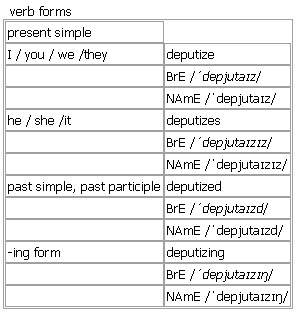 depu·tize (BrE also-ise) [deputize deputizes deputized deputizing] BrE [ˈdepjutaɪz] NAmE [ˈdepjutaɪz] verb intransitive ~ (for sb) to do sth that sb in a higher position than you would usually do •Ms Green has asked me to deputize for her at the meeting. Verb forms: