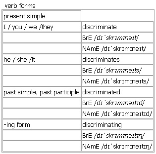 dis·crim·in·ate AW [discriminate discriminates discriminated discriminating] BrE [dɪˈskrɪmɪneɪt] NAmE [dɪˈskrɪmɪneɪt] verb 1. intransitive, transitive to recognize that there is a difference between people or things; to show a difference between people or things Syn: ↑differentiate, Syn: ↑distinguish •~ (between A and B) The computer program was unable to discriminate between letters and numbers. •~ sth When do babies learn to discriminate voices? •~ A from B A number of features discriminate this species from others. 2. intransitive to treat one person or group worse/better than another in an unfair way •~ (against sb) | ~ (in favour of sb) practices that discriminate against women and in favour of men •~ (on the grounds of sth) It is illegal to discriminate on grounds of race, sex or religion. Verb forms: Word Origin: early 17th cent.: from Latin discriminat- ‘distinguished between’, from the verb discriminare, from discrimen ‘distinction’, from the verb discernere, from dis- ‘apart’ + cernere ‘to separate’. Example Bank: •He claims he was racially discriminated against when he applied for the job. •The present law discriminates unfairly against women. •They discriminate positively in favour/favor of workers from ethnic minorities. •Workers must avoid discriminating on the grounds of race or sex. •practices that discriminate against women