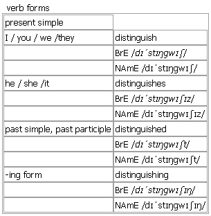 dis·tin·guish [distinguish distinguishes distinguished distinguishing] BrE [dɪˈstɪŋɡwɪʃ] NAmE [dɪˈstɪŋɡwɪʃ] verb 1. intransitive, transitive to recognize the difference between two people or things Syn: ↑differentiate •~ between A and B At what age are children able to distinguish between right and wrong? • English law clearly distinguishes between murder and manslaughter. •~ A from B It was hard to distinguish one twin from the other. •~ A and B Sometimes reality and fantasy are hard to distinguish. •We can distinguish five meanings of the word ‘mad’. 2. transitive (not used in the progressive tenses)~ A (from B) to be a characteristic that makes two people, animals or things different • What was it that distinguished her from her classmates? • The male bird is distinguished from the female by its red beak. •Does your cat have any distinguishing marks? •The power of speech distinguishes human beings from animals. 3. transitive (not used in the progressive tenses)~ sth to be able to see or hear sth Syn: ↑differentiate, Syn: ↑make out • I could not distinguish her words, but she sounded agitated. • She could not distinguish the make and colour of the car in the fading light. 4. transitive ~ yourself (as sth) to do sth so well that people notice and admire you •She has already distinguished herself as an athlete. Derived Word: ↑distinguishable Verb forms: Word Origin: late 16th cent.: formed irregularly from French distinguer or Latin distinguere, from dis- ‘apart’ + stinguere ‘put out’ (from a base meaning ‘prick’). Thesaurus: distinguish verb 1. I, T •It was hard to distinguish one twin from the other. tell • |especially written differentiate • distinguish/differentiate/tell A from B distinguish/differentiate between A and B clearly/sharply/carefully distinguish/differentiate sb/sth Distinguish or differentiate? Differentiate is more formal, used more in scientific matters than in matters of human judgement: •At what are are children able to distinguish between right and wrong? ✗ differentiate between right and wrong 2. T •What is is that distinguishes her from her classmates? set sb/sth apart • |especially written differentiate • distinguish/set apart/differentiate A from B a feature distinguishes/sets apart/differentiates A from B a factor distinguishes/differentiates A from B Example Bank: •It is often difficult to distinguish clearly between fact and fiction in this book. •She could not distinguish one child from another. •Small children have difficulty distinguishing fiction from reality. •The adult bird can be readily distinguished by its orange bill. •Troops cannot always reliably distinguish between combatants and civilians. •Retailers should distinguish clearly between full-price and sale items.