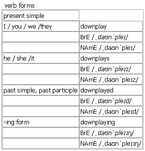 down·play [downplay downplays downplayed downplaying] BrE [ˌdaʊnˈpleɪ] NAmE [ˌdaʊnˈpleɪ] verb ~ sth to make people think that sth is less important than it really is Syn: play down •The coach is downplaying the team's poor performance. Verb forms:
