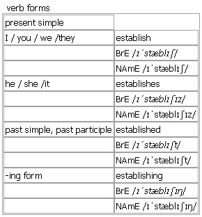 es·tab·lish AW [establish establishes established establishing] BrE [ɪˈstæblɪʃ] NAmE [ɪˈstæblɪʃ] verb
