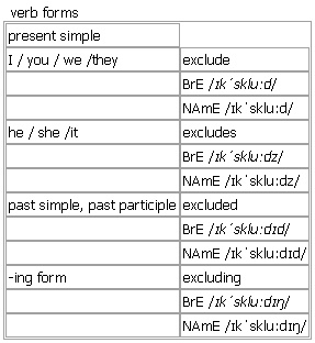 ex·clude AW [exclude excludes excluded excluding] BrE [ɪkˈskluːd] NAmE [ɪkˈskluːd] verb 1. ~ sth (from sth) to deliberately not include sth in what you are doing or considering • The cost of borrowing has been excluded from the inflation figures. • Try excluding fat from your diet. •Buses run every hour, Sundays excluded. Opp: ↑include 2. ~ sb/sth (from sth) to prevent sb/sth from entering a place or taking part in sth • Women are still excluded from some London clubs. • (BrE) Concern is growing over the number of children excluded from school (= not allowed to attend because of bad behaviour). •She felt excluded by the other girls (= they did not let her join in what they were doing). 3. ~ sth to decide that sth is not possible •We should not exclude the possibility of negotiation. •The police have excluded theft as a motive for the murder. Opp: ↑include Verb forms: Word Origin: late Middle English: from Latin excludere, from ex- ‘out’ + claudere ‘to shut’. Thesaurus: exclude verb 1. T •We should not exclude the possibility of negotiation. rule sb/sth out • • eliminate • Opp: include exclude/rule out/eliminate sth as sth exclude/rule out/eliminate sth from sth exclude/rule out/eliminate a/an possibility/explanation 2. T, often passive •Women are still excluded from some golf clubs. keep sb/sth out • • shut sb/sth out • • blacklist • |formal ostracize • Opp: admit, Opp: accept feel excluded/ostracized Exclude, keep sb/sth out or shut sb/sth out? Exclude is slightly more formal and usually refers to a rule or policy; keep sb/sth out and shut sb/sth out usually refer to sth such as a door or barrier which physically stops sb from entering a place. Example Bank: •Certain groups tend to be excluded from full participation in society. •Many local people felt excluded from decisions that affected their own community. •The measure would serve to exclude certain voters. •The possibility of error cannot be absolutely excluded. •Unlawfully obtained evidence is not automatically excluded from a criminal trial. •Women in such societies are effectively excluded from public affairs. •Women were excluded from the club. •a clause that seeks to exclude liability for death or serious injury •a club that has traditionally excluded minorities and women •services designed to assist the socially excluded •Concern is growing over the number of children excluded from school. •Large multinationals can make bids which effectively exclude local firms. •She saw herself as an outsider trying to enter a world that sought to exclude her. •The panel recommended that he also be excluded from serving on any committees. •Try to exclude sugar and fat from your diet. •Women are still excluded from some golf clubs.