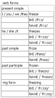 freeze [freeze freezes froze freezing frozen] verb, noun BrE [friːz] NAmE [friːz] verb (frozeBrE [frəʊz] ; NAmE [froʊz] fro·zenBrE [ˈfrəʊzn] ; NAmE [ˈfroʊzn] ) BECOME ICE 1. intransitive, transitive to become hard, and often turn to ice, as a result of extreme cold; to make sth do this • Water freezes at 0°C. • It's so cold that even the river has frozen. •~ sth The cold weather had frozen the ground. •+ adj. The clothes froze solid on the washing-line. Opp: ↑thaw OF PIPE/LOCK/MACHINE 2. intransitive, transitive if a pipe, lock or machine freezes, or sth freezes it, it becomes blocked with frozen liquid and therefore cannot be used •~ (up) The pipes have frozen, so we've got no water. •~ sth (up) Ten degrees of frost had frozen the lock on the car. OF WEATHER 3. intransitive when it freezes, the weather is at or below 0° Celsius • It may freeze tonight, so bring those plants inside. BE VERY COLD 4. intransitive, transitive to be very cold; to be so cold that you die • Every time she opens the window we all freeze. • Two men froze to death on the mountain. •~ sb Two men were frozen to death on the mountain. FOOD 5. transitive ~ sth to keep food at a very low temperature in order to preserve it • Can you freeze this cake? • These meals are ideal for home freezing. 6. intransitive to be able to be kept at a very low temperature • Some fruits freeze better than others. STOP MOVING 7. intransitive to stop moving suddenly because of fear, etc • I froze with terror as the door slowly opened. • (figurative) The smile froze on her lips. •The police officer shouted ‘Freeze!’ and the man dropped the gun. COMPUTER 8. intransitive when a computer screen freezes, you cannot move any of the images, etc. on it, because there is a problem with the system FILM/MOVIE 9. transitive ~ sth to stop a film/movie or video in order to look at a particular picture •Freeze the action there! see also ↑freeze-frame WAGES/PRICES 10. transitive ~ sth to hold wages, prices, etc. at a fixed level for a period of time Syn: ↑peg • Salaries have been frozen for the current year. MONEY/BANK ACCOUNT 11. transitive ~ sth to prevent money, a bank account, etc. from being used by getting a court order which bans it • The company's assets have been frozen. more at stop/halt/freeze in your tracks at ↑track n. Verb forms: Word Origin: Old English frēosan (in the phrase hit frēoseth ‘it is freezing’), of Germanic origin; related to Dutch vriezen and German frieren, from an Indo-European root shared by Latin pruina ‘hoar frost’ and ↑frost. Example Bank: •He was so surprised he froze to the spot. •His smile froze for a moment. •Hundreds of homeless people could freeze to death this winter. •Maggie's face had frozen into a cold mask. •Many vegetables freeze very well. •Prices have been frozen at this level for over a year now. •Salaries were effectively frozen for six months. •She froze with horror when she saw the body. •Suddenly, Ronny seemed to freeze. •The lake has frozen over. •The pipes have frozen up. •The pond had frozen solid. •Turn up the heat— I'm freezing to death! •like water freezing into ice Idioms: ↑freeze your blood ▪ ↑make your blood freeze Derived: ↑freeze over ▪ ↑freeze somebody out noun OF WAGES/PRICES 1. the act of keeping wages, prices, etc. at a particular level for a period of time •a wage/price freeze STOPPING STH 2. usually singular ~ (on sth) the act of stopping sth •a freeze on imports COLD WEATHER 3. usually singular (BrE)an unusually cold period of weather during which temperatures stay below 0° Celsius •Farmers still talk about the big freeze of '99. 4. (NAmE)a short period of time, especially at night, when the temperature is below 0° Celsius •A freeze warning was posted for Thursday night. Word Origin: Old English frēosan (in the phrase hit frēoseth ‘it is freezing’), of Germanic origin; related to Dutch vriezen and German frieren, from an Indo-European root shared by Latin pruina ‘hoar frost’ and ↑frost. Example Bank: •Internet advertising is still in a deep freeze. •It's too expensive to lift the freeze on pay. •The government has imposed a price freeze on bread. •The weather report advised us to prepare for a big freeze. •a complete freeze on emissions •a freeze on bus fares •a total freeze on gas emissions