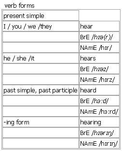 hear [hear hears heard hearing] BrE [hɪə(r)] NAmE [hɪr] verb (heard, heardBrE [hɜːd] ; NAmE [hɜːrd] ) 1. intransitive, transitive (not used in the progressive tenses)to be aware of sounds with your ears • I can't hear very well. •~ sth/sb She heard footsteps behind her. •I couldn't hear anything. •~ sb/sth doing sth He could hear a dog barking. •~ sb/sth do sth Did you hear him go out? •I heard a car drive off. •~ what… Didn't you hear what I said? •sb/sth is heard to do sth She has been heard to make threats to her former lover. 2. transitive (not used in the progressive tenses)to listen or pay attention to sb/sth •~ sth Did you hear that play on the radio last night? •a chance to hear the first movement again •to hear both sides of the argument •~ sb/sth/yourself do sth Be quiet— I can't hear myself think! (= it is so noisy that I can't think clearly) •Have you ever heard him lecture? •~ what… We'd better hear what they have to say. •I hear what you're saying (= I have listened to your opinion), but you're wrong. 3. intransitive, transitive (not usually used in the progressive tenses)to be told about sth • Haven't you heard? She resigned. • ‘I'm getting married.’ ‘So I've heard.’ •Things are going well from what I hear. •~ about sb/sth I was sorry to hear about your accident. •Wait till he hears about this. •I've heard about people like you. •~ sth We had heard nothing for weeks. •I was delighted to hear your good news. •~ (that)… I was surprised to hear (that) he was married. •I hear you've been away this weekend. •~ it said (that)… I've heard it said (that) they met in Italy. •~ what, how, etc… Did you hear what happened? 4. transitive ~ sth to listen to and judge a case in court •The appeal was heard in private. •Today the jury began to hear the evidence. Rem: or more at hear/see the last of sb/sththe last I heard at ↑last n., seeing/hearing things at ↑thing, make your voice heard at ↑voice n. Idioms: ↑I've heard it all before ▪ ↑have you heard the one about …? ▪ ↑hear tell ▪ ↑hear! hear! ▪ ↑let's hear it for … ▪ ↑not hear the end of it ▪ ↑you could hear a pin drop ▪ ↑you hear? Derived: ↑hear from somebody ▪ ↑hear of somebody ▪ ↑hear somebody out ▪ ↑hear something from somebody ▪ ↑hear something of somebody ▪ ↑not hear of something Verb forms: Word Origin: Old English hīeran, hēran, of Germanic origin; related to Dutch hooren and German hören. Thesaurus: hear verb 1. I, T •She heard a noise. listen • • catch • • tune in (to sb/sth) • hear/listen to/catch/tune in to a radio show hear/listen to/catch sb's words/what sb says hear/listen to music/a conversation 2. I, T (not usually used in the progressive tenses) •I was sorry to hear that you'd been ill. find out • • discover • • find • • learn • hear/find out/learn about sth hear/find out/discover/find/learn that… hear/find out/discover/learn how/what/why… be surprised/saddened/delighted/interested to hear/discover/find/learn sth Example Bank: •‘Sheep?’ It sounded so unlikely that Sally did not think she could have heard correctly. •Can you hear me clearly at the back? •Distantly he heard the report of another gun. •He's getting old and he can't hear very well. •I could just hear the music in the distance. •I told Michael what he wanted to hear. •I was delighted to hear about your promotion. •I was sorry to hear of your father's death. •I was surprised to hear that she was married. •I've heard about this sort of thing before. •Let's hear you sing, then. •On hearing of his plight, a businessman offered him a job. •We hear very little about these issues nowadays. •You'd better not let Dad hear you say that. •‘He's being promoted.’ ‘ So I've heard. ’ •Be quiet— I can't hear myself think! •Didn't you hear what I said? •Don't decide until you've heard both sides of the argument. •Election events offer voters a chance to hear the candidates speak. •Haven't you heard? She's resigned. •I can't hear very well. •I couldn't hear anything. •I hear what you're saying, but you're wrong. •Wait till she hears about this! •We'd better hear what they have to say.