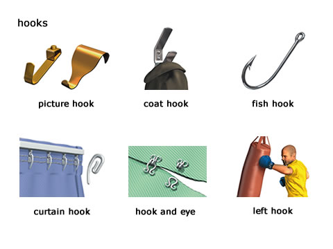 hook [hook hooks hooked hooking] noun, verb BrE [hʊk] NAmE [hʊk] noun  1. a curved piece of metal, plastic or wire for hanging things on, catching fish with, etc •a picture/curtain/coat hook •a fish hook • Hang your towel on the hook. see also ↑boathook 2. (in boxing)a short hard blow that is made with the elbow bent •a left hook to the jaw 3. (in ↑cricket and ↑golf)a way of hitting the ball so that it curves sideways instead of going straight ahead 4. a thing that is used to make people interested in sth • The images are used as a hook to get children interested in science. •Well-chosen quotations can serve as a hook to catch the reader's interest. more at ring off the hook at ↑ring 2 v., sling your hook at ↑sling v. Word Origin: Old English hōc, of Germanic origin; related to Dutch hoek ‘corner, angle, projecting piece of land’, also to German Haken ‘hook’. Example Bank: •The key was hanging from a hook. •Your coat's hanging on a hook behind the door. Idioms: ↑by hook or by crook ▪ ↑get off the hook ▪ ↑hook, line and sinker ▪ ↑let somebody off the hook ▪ ↑off the hook Derived: ↑hook somebody up ▪ ↑hook somebody up with somebody ▪ ↑hook up ▪ ↑hook up with somebody verb 1. transitive, intransitive to fasten or hang sth on sth else using a hook; to be fastened or hanging in this way •~ sth + adv./prep. We hooked the trailer to the back of the car. •+ adv./prep. a dress that hooks at the back 2. transitive, intransitive to put sth, especially your leg, arm or finger, around sth else so that you can hold onto it or move it; to go around sth else in this way •~ sth + adv./prep. He hooked his foot under the stool and dragged it over. •She hooked her arm through her sister's. •He managed to hook his fingers under the stone. •Her thumbs were hooked into the pockets of her jeans. •Hook the rope through your belt. •+ adv./prep. Suddenly an arm hooked around my neck. 3. transitive ~ sth to catch a fish with a hook •It was the biggest pike I ever hooked. • (figurative)She had managed to hook a wealthy husband. 4. transitive ~ sth (especially in ↑golf, ↑cricket or football ( ↑soccer ))to hit or kick a ball so that it goes to one side instead of straight ahead •He hooked his drive into the trees. •I hooked the first ball for a six. •He hooked his shot over the bar. •Try and hook the ball around the defenders. Verb forms: Word Origin: Old English hōc, of Germanic origin; related to Dutch hoek ‘corner, angle, projecting piece of land’, also to German Haken ‘hook’. Example Bank: •He hooked an arm around her neck. •He hooked the rope over a branch. •The boat was moored to an anchor firmly hooked into the bank.