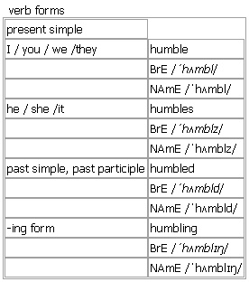hum·ble [humble humbles humbled humbling humbler humblest] adjective, verb BrE [ˈhʌmbl] NAmE [ˈhʌmbl] adjective (hum·blerBrE [ˈhʌmblə(r)] ; NAmE [ˈhʌmblər] hum·blestBrE [ˈhʌmblɪst] ; NAmE [ˈhʌmblɪst] ) 1. showing you do not think that you are as important as other people Syn: ↑modest •Be humble enough to learn from your mistakes. •my humble tribute to this great man see also ↑humility 2. (ironic or humorous)used to suggest that you are not as important as other people, but in a way that is not sincere or not very serious •In my humble opinion, you were in the wrong. •My humble apologies. I did not understand. 3. having a low rank or social position •a man of humble birth/origins •a humble occupation •the daughter of a humble shopkeeper 4. (of a thing)not large or special in any way Syn: ↑modest •a humble farmhouse •The company has worked its way up from humble beginnings to become the market leader. •Most of us have never considered the humble potato as a precious gift from nature. see eat humble pie at ↑eat Word Origin: Middle English: from Old French, from Latin humilis ‘low, lowly’, from humus ‘ground’. Example Bank: •She was very humble and apologetic. •a man of fairly humble origins •an amazing man who makes you feel quite humble •He had worked his way up from humble beginnings. •He is intensely proud of his humble background. •He was a made who had risen from humble origins through hard work and good fortune. •She felt humble and grateful but couldn't put her feelings into words. •She was the daughter of a humble carpenter and a washerwoman. •She's a loving, kind and humble woman. Derived Word: ↑humbly verb 1. ~ sb to make sb feel that they are not as good or important as they thought they were •He was humbled by her generosity. •a humbling experience 2. usually passive ~ sb to easily defeat an opponent, especially a strong or powerful one •The world champion was humbled last night in three rounds. 3. ~ yourself to show that you are not too proud to ask for sth, admit that you have been wrong, etc. see also ↑humility Verb forms: Word Origin: Middle English: from Old French, from Latin humilis ‘low, lowly’, from humus ‘ground’.
