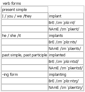 verb BrE [ɪmˈplɑːnt] ; NAmE [ɪmˈplænt]