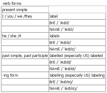 label AW [label labels labelled labeled labelling labeling] noun, verb BrE [ˈleɪbl] NAmE [ˈleɪbl] noun  1. a piece of paper, etc. that is attached to sth and that gives information about it Syn: ↑tag, Syn: ↑ticket • The washing instructions are on the label. •price/address labels • We tested various supermarkets' own label pasta sauces (= those marked with the name of the shop/store where they are sold). •He'll only wear clothes with a designer label. 2. (disapproving)a word or phrase that is used to describe sb/sth in a way that seems too general, unfair or not correct •I hated the label ‘housewife’. 3. a company that produces and sells music, CDs, etc •the Virgin record label •It's his first release for a major label. Word Origin: Middle English (denoting a narrow strip): from Old French, ribbon. Thesaurus: label noun C •The label says it's 100% cotton. tag • • sticker • a price label/tag/sticker a name label/tag have/attach/put on/stick on a label/tag/sticker The label/tag/sticker says… Synonyms: label tag • sticker These are all words for a piece of paper, fabric or plastic that is attached to sth and gives information about it. label • a small piece of paper, fabric or plastic that is attached to sth in order to show what it is or give information about it: ▪ The washing instructions are on the label. ◇ ▪ address labels ◇ ▪ He'll only wear clothes with a ▪ designer label ▪. tag • (often used in compounds) a small piece of paper, fabric or plastic that is attached to sth, or that sb wears, in order to give information about it/them: ▪ Everyone at the conference had to wear a name tag. label or tag? Labels in clothes are usually made of fabric and sewn in. Tags on clothes are usually made of cardboard and cut off before you wear the clothes. A name tag can be stuck or tied onto sb to show who they are: ▪ All babies in the hospital have name tags tied round their ankles. Price tag is much more frequent than price label and is used for both literal and figurative meanings: ▪ What does the price tag say? ◇ ▪ There is a £20 million price tag on the team's star player. A label can also be a sticker that you put on an envelope. sticker • a sticky label with a picture or message on it, that you stick on to sth. a price label/tag/sticker to have a label/tag/sticker to attach/put on/stick on a label/tag/sticker The label/tag/sticker says… Example Bank: •Designer labels grew by nearly 4% in 2007. •It doesn't have a price label on it. •One sometimes feels that the label ‘classic’ is applied to any book that is dull. •She stuck labels on all the jars. •The band are hoping to sign with a major label by the end of the year. •The band is hoping to sign with a major label. •The care label says ‘dry-clean only’. •The record was produced under the Virgin label. •What does it say on the label? •Why do we need to attach a label to these feelings? •clothes with a designer label •He was cruelly given the label ‘Mr Zero’ by the Press. •It's his first release for a major label. •This program produces address labels from your database. •We tested various supermarkets' own label pasta sauces. verb (-ll-, especially US -l-)often passive 1. ~ sth to fix a label on sth or write information on sth • We carefully labelled each item with the contents and the date. • The file was labelled ‘Private’. 2. to describe sb/sth in a particular way, especially unfairly •~ sb/sth (as) sth | ~ sb/sth + noun He was labelled (as) a traitor by his former colleagues. •~ sb/sth + adj. It is unfair to label a small baby as naughty. Verb forms: Word Origin: Middle English (denoting a narrow strip): from Old French, ribbon. Thesaurus: label verb T, often passive •Each box was labelled with a code number. mark • • tag • • flag • label/mark/tag/flag sth with sth label/mark boxes/bags label/mark sth clearly/carefully Label or mark? When you say sth is labelled, you do not need to give more details if the context is clear; when you use mark, you usually say exactly how sth is marked •The path is marked on the map in red. • Make sure your luggage is clearly labelled (= with your name and address). Example Bank: •It would be easy to label the boys as troublemakers. •She had automatically labelled the boys as troublemakers. •She was falsely labelled/labeled a liar. •She was wrongly labelled a liar. •Some of the plants were wrongly labelled. •The samples were all labelled with a date and place of origin. •a pile of small plastic bags, each carefully labelled/labeled. •Every box needs to be labelled before it goes into storage. •Make sure that all your luggage is clearly labelled.
