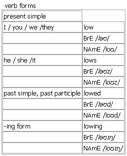 low [low lows lowed lowing lower lowest] adjective, adverb, noun, verb BrE [ləʊ] NAmE [loʊ]
