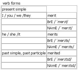 merit [merit merits merited meriting] noun, verb BrE [ˈmerɪt] NAmE [ˈmerɪt]