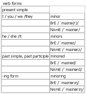 minor AW [minor minors minored minoring] adjective, noun, verb BrE [ˈmaɪnə(r)] NAmE [ˈmaɪnər] adjective 1. usually before noun not very large, important or serious •a minor road •minor injuries •to undergo minor surgery •youths imprisoned for minor offences • There may be some minor changes to the schedule. • Women played a relatively minor role in the organization. Opp: ↑major 2. (music)based on a ↑scale in which the third note is a semitone/half tone higher than the second note •the key of C minor compare ↑major Word Origin: Middle English: from Latin, smaller, less; related to minuere ‘lessen’. The term originally denoted a Franciscan friar, suggested by the Latin name Fratres Minores (‘Lesser Brethren’), chosen by St Francis for the order. Thesaurus: minor adj. usually before noun •There may be some minor changes to the schedule. slight • • small • • modest • |especially spoken little • |especially written insignificant • • unimportant • • marginal • |often disapproving trivial • • petty • |formal, especially business peripheral • Opp: major, Opp: serious, Opp: severe minor/small/little/unimportant/trivial/petty/peripheral things minor/small/little/insignificant/unimportant/trivial details a minor/slight/small/little/trivial/petty problem minor/petty crime/theft/criminals Example Bank: •That's a relatively minor matter. We can leave it till later. •This is a very minor operation and there is very little risk involved. •A minor snag is that it's expensive. •Both the driver and the passenger suffered minor injuries. •His only injuries were some minor scratches above his eye. •Minor skirmishes broke out all along the border. •Most of these youths are in prison for minor offences. •The CD contains a number of delightful short pieces by minor composers. •The letter's survival is something of a minor miracle. •The new plan involves widening a minor road through the valley. •The novel is now regarded as a minor classic. •You may need to undergo minor surgery. Derived: ↑minor in something noun 1. (law)a person who is under the age at which you legally become an adult and are responsible for your actions •It is an offence to serve alcohol to minors. •He was jailed for having sex with a minor. 2. (especially NAmE)a subject that you study at university in addition to your ↑major Word Origin: Middle English: from Latin, smaller, less; related to minuere ‘lessen’. The term originally denoted a Franciscan friar, suggested by the Latin name Fratres Minores (‘Lesser Brethren’), chosen by St Francis for the order. verb compare ↑major Verb forms: Word Origin: Middle English: from Latin, smaller, less; related to minuere ‘lessen’. The term originally denoted a Franciscan friar, suggested by the Latin name Fratres Minores (‘Lesser Brethren’), chosen by St Francis for the order.