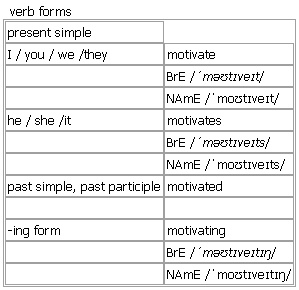 mo·tiv·ate AW [motivate motivates motivated motivating] BrE [ˈməʊtɪveɪt] NAmE [ˈmoʊtɪveɪt] verb 1. often passive ~ sb to be the reason why sb does sth or behaves in a particular way •He is motivated entirely by self-interest. 2. to make sb want to do sth, especially sth that involves hard work and effort •~ sb She's very good at motivating her students. •~ sb to do sth The plan is designed to motivate employees to work more efficiently. 3. ~ sth (SAfrE, formal)to give reasons for sth that you have stated •Please motivate your answer to question 5. Derived Words: ↑motivated ▪ ↑motivation ▪ ↑motivational ▪ ↑motivator Verb forms: Example Bank: •He was motivated to join the union because he objected to the new contract. •His greatest quality is the way he motivates his team. •She's very good at motivating her students. •We created the conditions whereby the child is motivated to speak. •What motivates people to carry out such attacks? Example Bank: •The attack was racially motivated. •The attack was thought to be racially motivated. •a highly motivated group of workers