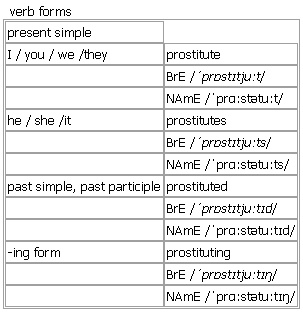 pros·ti·tute [prostitute prostitutes prostituted prostituting] noun, verb BrE [ˈprɒstɪtjuːt] NAmE [ˈprɑːstətuːt] noun a person who has sex for money Word Origin: mid 16th cent. (as a verb): from Latin prostitut- ‘exposed publicly, offered for sale’, from the verb prostituere, from pro- ‘before’ + statuere ‘set up, place’. Example Bank: •She was arrested and charged with being a common prostitute. •The prostitutes solicit openly here. •a book written by a former prostitute •the men who use prostitutes verb 1. ~ sth/yourself to use your skills, abilities, etc. to do sth that earns you money but that other people do not respect because you are capable of doing sth better •Many felt he was prostituting his talents by writing Hollywood scripts. 2. ~ yourself to work as a prostitute Verb forms: Word Origin: mid 16th cent. (as a verb): from Latin prostitut- ‘exposed publicly, offered for sale’, from the verb prostituere, from pro- ‘before’ + statuere ‘set up, place’.