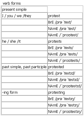 pro·test [protest protests protested protesting] noun, verb noun BrE [ˈprəʊtest] ; NAmE [ˈproʊtest] uncountable, countable the expression of strong disagreement with or opposition to sth; a statement or an action that shows this • The director resigned in protest at the decision. • The announcement raised a storm of protest. •a protest march •She accepted the charge without protest. •~ (against sth) The workers staged a protest against the proposed changes in their contracts. •The building work will go ahead, despite protests from local residents. •The riot began as a peaceful protest. Word Origin: late Middle English (as a verb in the sense ‘make a solemn declaration’): from Old French protester, from Latin protestari, from pro- ‘forth, publicly’ + testari ‘assert’ (from testis ‘witness’). Thesaurus: protest noun 1. U, C •The announcement raised a storm of protest. opposition • • resistance • • objection • • hostility • in protest/opposition/objection widespread/strong/fierce protests/opposition/resistance/objection/hostility provoke/meet with/face protests/opposition/resistance/objection/hostility 2. C •A massive anti-war protest was planned. demonstration • • march • |BrE, informal demo • a protest/demonstration/march/demo against sth a/an anti-war/pro-democracy/anti-government protest/demonstration/march/demo hold/organize/stage/go on/join/participate in/take part in a protest/demonstration/march/demo Protest or demonstration? A demonstration can be for or against sb/sth; a protest is always against sb/sth. A demonstration is usually about a more public, wider issue that may affect a whole country; a protest can be about a more private matter, for example by workers against their employers. Example Bank: •The Samoan team lodged a formal protest after the referee sent off the wrong player. •The Samoan team lodged a formal protest against the decision. •The announcement brought cries of protest from the crowd. •The constitution guarantees the right of peaceful protest. •The crowd dispersed without protest. •The government has made an official protest. •The new tax sparked a wave of public protest. •The party boycotted the election in protest at alleged vote rigging. •The strikers returned to work, but under protest. •There had been a number of public protests against the new tax. •Winters quit the company board in protest of Eisner's plans. •a protest about the new bypass •a rooftop protest by prison inmates •a student protest over tuition fees •street protests by residents •She accepted the charge without protest. •The announcement raised a storm of protest. Idiom: ↑under protest verb BrE [prəˈtest] ; NAmE [prəˈtest] ; [ˈproʊtest] 1. intransitive, transitive to say or do sth to show that you disagree with or disapprove of sth, especially publicly •~ (about/against/at sth) Students took to the streets to protest against the decision. • The victim's widow protested at the leniency of the sentence. •There's no use protesting, I won't change my mind. •~ sth (NAmE)They fully intend to protest the decision. 2. transitive to say firmly that sth is true, especially when you have been accused of sth or when other people do not believe you •~ sth She has always protested her innocence. •~ that… He protested that the journey was too far by car. •+ speech ‘That's not what you said earlier!’ Jane protested. Verb forms: Word Origin: late Middle English (as a verb in the sense ‘make a solemn declaration’): from Old French protester, from Latin protestari, from pro- ‘forth, publicly’ + testari ‘assert’ (from testis ‘witness’). Thesaurus: protest verb I, T •He protested that he would not receive a fair trial. object • • complain • protest/complain about/at sth protest/object/complain to sb protest/object/complain that… Synonyms: complain protest • object • grumble • moan • whine These words all mean to say that you are annoyed, unhappy or not satisfied about sb/sth. complain • to say that you are annoyed, unhappy or not satisfied about sb/sth: ▪ I'm going to complain to the manager about this. protest • to say or do sth to show that you disagree with or disapprove of sth, especially publicly; to give sth as a reason for protesting: ▪ Students took to the streets to ▪ protest against ▪ the decision. object • to say that you disagree with or disapprove of sth; to give sth as a reason for objecting: ▪ If nobody objects, we'll postpone the meeting till next week. ◇ ▪ He objected that the police had arrested him without sufficient evidence. grumble • (rather informal, disapproving) to complain about sb/sth in a bad-tempered way: ▪ They kept grumbling that they were cold. moan • (BrE, rather informal, disapproving) to complain about sb/sth in an annoying way: ▪ What are you moaning on about now? whine • (rather informal, disapproving) to complain in an annoying, crying voice: ▪ Stop whining! ◇ ▪ ‘I want to go home,’ whined Toby. Whine is often used to talk about the way that young children complain. to complain/protest/grumble/moan/whine about sth to complain/protest/grumble/moan at sth to complain/protest/object/grumble/moan/whine to sb to complain/protest/object/grumble/moan/whine that… Example Bank: •Crowds gathered to protest about the police violence. •Many people have protested at the cuts in state benefits. •Many people protested over the tax increase. •They were exercising their lawful right to protest. •They were protesting against the proposed agreement. •We have protested to the government. •When he tried to protest, she insisted. •protesting over an income tax increase •the right to protest peacefully •‘That's not what you said earlier!’ Jane protested. •It's no use protesting, I won't change my mind. •She has always protested her innocence. •She protested that she coul