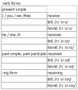 re·ceive [receive receives received receiving] BrE [rɪˈsiːv] NAmE [rɪˈsiːv] verb GET/ACCEPT 1. transitive (rather formal)to get or accept sth that is sent or given to you •~ sth to receive a letter/present/phone call •to receive information/payment/thanks •~ sth from sb/sth He received an award for bravery from the police service. TREATMENT/INJURY 2. transitive to experience or be given a particular type of treatment or an injury •~ sth from sb We received a warm welcome from our hosts. •~ sth Emergency cases will receive professional attention immediately. •to receive severe injuries REACT TO STH 3. transitive, usually passive to react to sth new, in a particular way •~ sth + adv./prep. The play was well received by the critics. • The proposals have been favourably received by most political commentators. •~ sth with sth The statistics were received with concern. GUESTS 4. transitive, often passive ~ sb (with sth) | ~ sb (as sth) (formal)to welcome or entertain a guest, especially formally •He was received as an honoured guest at the White House. AS MEMBER OF STH 5. transitive ~ sb (into sth) (formal)to officially recognize and accept sb as a member of a group •Three young people were received into the Church at Easter. TV/RADIO 6. transitive ~ sth to change broadcast signals into sounds or pictures on a television, radio, etc •to receive programmes via satellite 7. transitive ~ sth/sb to be able to hear a radio message that is being sent by sb •I'm receiving you loud and clear. STOLEN GOODS 8. transitive, intransitive ~ (sth) (especially BrE)to buy or accept goods that you know have been stolen IN SPORT 9. intransitive, transitive ~ (sth) (in ↑tennis, etc.)to be the player that the ↑server hits the ball to •She won the toss and chose to receive. Idiom: ↑at the receiving end Verb forms: Word Origin: Middle English: from Anglo-Norman French receivre, based on Latin recipere, from re- ‘back’ + capere ‘take’. Thesaurus: receive verb 1. T (especially written) •I've just received this letter from an old friend. collect • • accept • |especially spoken get • |especially written reap • |formal derive sth from sth • receive/collect/accept/get/reap/derive sth from sb/sth receive/collect/accept/get a/an medal/award/prize receive/get a/an reply/letter/shock/impression/prison sentence Receive or get? Receive is a more formal word; get is the more usual word in spoken English. You can get or receive a sudden feeling such as a shock or an impression, but feelings that you experience over a period of time such as enjoyment and satisfaction you usually get. 2. T (especially written) •Several passengers received severe injuries. have • • take • |especially spoken get • |especially written suffer • • experience • • undergo • receive/get/have/suffer an injury receive/get/have/suffer/experience a/the shock receive/get/have/experience/undergo treatment Receive or suffer? You can receive or suffer an injury. Suffer gives more emphasis to the bad effects experienced. 3. I •The play was well received by the critics. meet sth with sth • • take • • respond • • react • |especially written greet • receive sth/meet sth/react/greet sth with dismay receive sth/take sth/respond/react well/badly receive sth/respond/react/greet sth coolly/enthusiastically Example Bank: •Any help or donations will be gratefully received. •I just received a call from a concerned parent. •I received a package from my mother. •The news was received with dismay. •The play was very well received. •The speech was badly received by Republican leaders. •They currently receive subsidies from the government. •You can expect to receive compensation for all direct expenses arising out of the accident. •You might be entitled to receive housing benefit. •You will automatically receive updates by text message. •a device for sending and receiving electronic signals •I've just received this letter from an old friend. •Please let me know as soon as you receive payment. •Several of the passengers received severe injuries.