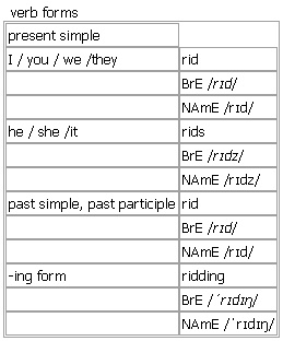 rid [rid rids ridding] BrE [rɪd] NAmE [rɪd] verb (rid·ding, rid, rid) more at want rid of sb/sth at ↑want v. Idioms: ↑get rid of somebody ▪ ↑rid of somebody Derived: ↑rid somebody of somebody ▪ ↑rid yourself of somebody Verb forms: Word Origin: Middle English: from Old Norse rythja. The original sense ‘to clear’ described clearing land of trees and undergrowth; this gave rise to ‘free from rubbish or encumbrances’, later becoming generalized. Example Bank: •I cannot rid myself of the fear of running short of money. •She tried to rid herself of her guests. •The Prime Minister's aim was to rid the country of socialism forever.