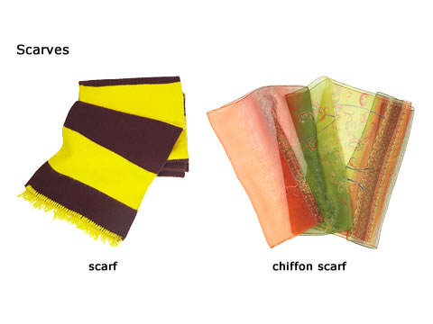 Example Bank: •He wrapped his scarf around his neck. •Her hair was covered by a silk scarf. •She had a scarf tied over her head.