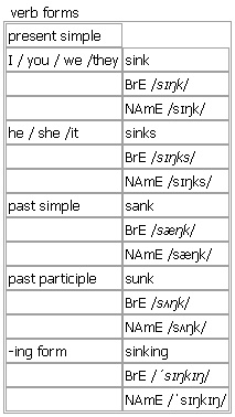 verb (sankBrE [sæŋk] ; NAmE [sæŋk] sunkBrE [sʌŋk] ; NAmE [sʌŋk] )or (less frequent sunk, sunk