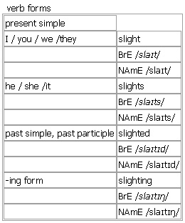 slight [slight slights slighted slighting slighter slightest] adjective, noun, verb BrE [slaɪt] NAmE [slaɪt] adjective (slight·er, slight·est) 1. very small in degree •a slight increase/change/delay/difference • I woke up with a slight headache. • The damage was slight. •She takes offence at the slightest thing (= is very easily offended). •There was not the slightest hint of trouble. •He is, without the slightest doubt, the greatest living novelist. •He never had the slightest intention of agreeing to it. •The picture was at a slight angle. •A slight breeze was blowing. 2. small and thin in size •a slight woman •He was of slight build. •She was smaller and slighter than I had imagined. 3. (formal)not deserving serious attention •This is a very slight novel. Word Origin: Middle English; the adjective from Old Norse sléttr ‘smooth’ (an early sense in English), of Germanic origin; related to Dutch slechts ‘merely’ and German schlicht ‘simple’, schlecht ‘bad’; the verb (originally in the sense ‘make smooth or level’), from Old Norse slétta. The sense “treat with disrespect” dates from the late 16th cent. Thesaurus: slight adj. •The damage was slight. small • • modest • • minimal • • minor • • marginal • |especially written negligible • • insignificant • |especially spoken little • Opp: big, Opp: major a/an slight/small/modest/minimal/minor/marginal/insignificant/little change/difference/improvement a/an slight/small/minor/insigificant/little problem a slight/small/minor/little error/mistake/defect/accident a slight/small/minimal chance Slight or small? Use either word to talk about changes or problems. Use slight but not small to talk about medical problems, feelings or things that affect the senses; use small but not slight to talk about amounts •a slight cold/headache/movement/touch • a small amount/number/quantity, etc. Example Bank: •She looked very slight, almost fragile. •She never had the slightest intention of agreeing. •She smiled to hide her slight embarrassment. •She spoke with a slight foreign accent. •She takes offence at the slightest thing. •The accident had left him with a slight limp. •The eyes of predators are highly sensitive to the slightest movement. •The slight figure of a woman emerged from the house. •The slightest noise will wake him. •The slightest touch will set off the alarm. •There's been a slight increase in the number of unemployed in this area. •Unfortunately, this plate has a slight flaw in it. •You may experience some slight discomfort after the operation. Idiom: ↑not in the slightest Derived Word: ↑slighting noun ~ (on sb/sth) an act or a remark that criticizes sth or offends sb Syn: ↑insult • Nick took her comment as a slight on his abilities as a manager. Word Origin: Middle English; the adjective from Old Norse sléttr ‘smooth’ (an early sense in English), of Germanic origin; related to Dutch slechts ‘merely’ and German schlicht ‘simple’, schlecht ‘bad’; the verb (originally in the sense ‘make smooth or level’), from Old Norse slétta. The sense “treat with disrespect” dates from the late 16th cent. verb usually passive ~ sb to treat sb rudely or without respect Syn: ↑insult • She felt slighted because she hadn't been invited. Verb forms: Word Origin: Middle English; the adjective from Old Norse sléttr ‘smooth’ (an early sense in English), of Germanic origin; related to Dutch slechts ‘merely’ and German schlicht ‘simple’, schlecht ‘bad’; the verb (originally in the sense ‘make smooth or level’), from Old Norse slétta. The sense “treat with disrespect” dates from the late 16th cent.