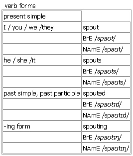 spout [spout spouts spouted spouting] noun, verb BrE [spaʊt] NAmE [spaʊt] noun 1. a pipe or tube on a container, that you can pour liquid out through •the spout of a teapot 2. a stream of liquid coming out of somewhere with great force Syn: ↑fountain Word Origin: Middle English (as a verb): from Middle Dutch spouten, from an imitative base shared by Old Norse spýta ‘to spit’. Idiom: up the spout verb 1. transitive, intransitive to send out sth, especially a liquid, in a stream with great force; to come out of sth in this way Syn: ↑pour •~ sth (from sth) The wound was still spouting blood. •The geyser spouted huge columns of water from the ground. •~ from/out of sth Clear water spouted from the fountains. 2. intransitive (of a ↑whale)to send out a stream of water from a hole in its head 3. intransitive, transitive (informal, disapproving)to speak a lot about sth; to repeat sth in a boring or annoying way •~ (off/on) (about sth) He's always spouting off about being a vegetarian. •What are you spouting on about now? •~ sth He could spout poetry for hours. •She could do nothing but spout insults. •The article was full of the usual clichés spouted by fashion editors. Verb forms: Word Origin: Middle English (as a verb): from Middle Dutch spouten, from an imitative base shared by Old Norse spýta ‘to spit’.