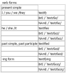test·ify [testify testifies testified testifying] BrE [ˈtestɪfaɪ] NAmE [ˈtestɪfaɪ] verb (testi·fies, testi·fy·ing, testi·fied, testi·fied) 1. intransitive, transitive to make a statement that sth happened or that sth is true, especially as a witness in court •~ (against/for sb) She refused to testify against her husband. •There are several witnesses who will testify for the defence. •~ about sth He was summoned to testify before a grand jury about his role in the affair. •~ to sth/to doing sth Evans testified to receiving $200 000 in bribes. •~ (that)… He testified (that) he was at the theatre at the time of the murder. •+ speech ‘I was approached by a man I did not recognize,’ she testified. 2. transitive ~ (that)… (formal)to say that you believe sth is true because you have evidence of it •Too many young people are unable to write or spell well, as employers will testify. 3. intransitive (especially NAmE)to express your belief in God publicly Derived: ↑testify to something Verb forms: Word Origin: late Middle English: from Latin testificari, from testis ‘a witness’. Example Bank: •A senior officer testified to the existence of police hit squads. •He took the stand to testify at the trial of his colleague. •Several witnesses have come forward to testify against her. •She refused to testify against her brother. •She was unwilling to testify before Congress. •The basis for the perjury conviction was he had testified falsely under oath. •The president's former aides were called to testify at his trial. •a Mafia member who was prepared to testify for the authorities