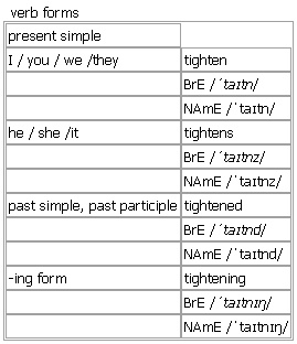 tight·en [tighten tightens tightened tightening] BrE [ˈtaɪtn] NAmE [ˈtaɪtn] verb 1. intransitive, transitive to become or make sth become tight or tighter •~ (up) The rope holding the boat suddenly tightened and broke. •His mouth tightened into a thin line. •~ sth (up) to tighten a lid/screw/rope/knot •The nuts weren't properly tightened and the wheel came off. •She tightened her grip on his arm. •The brake cable needs tightening up. 2. transitive ~ sth to make sth become stricter •to tighten security •The government is to tighten controls on the sale of alcohol. Opp: ↑loosen Idiom: ↑tighten your belt Derived: ↑tighten up Verb forms: Synonyms: save budget • economize • tighten your belt These words all mean to spend less money. save • to keep money instead of spending it, often in order to buy a particular thing: ▪ I'm saving for a new car. budget • to be careful about the amount of money you spend; to plan to spend an amount of money for a particular purpose: ▪ If we budget carefully we'll be able to afford the trip. economize • to use less money, time, etc. than you normally use tighten your belt • (rather informal) to spend less money because there is less available: ▪ With the price increases, we are all having to tighten our belts. to save up/budget for sth to have to save/budget/economize/tighten our belts to try to/manage to save/budget/economize Example Bank: •He felt his stomach tighten. •He saw his father's jaw tighten in irritation. •He tightened his grip on my hand. •Her face tightened with pain. •Her fingers tightened convulsively with every jolt she received. •Her grip seemed to tighten on the door handle. •His hand tightened painfully around her wrist. •His mouth tightened into a thin hard line. •His words made her throat tighten. •Steps were taken to tighten discipline in the school. •The law in this area has been tightened up considerably. •The nuts weren't properly tightened and the wheel came off. •This tool is for tightening screws.