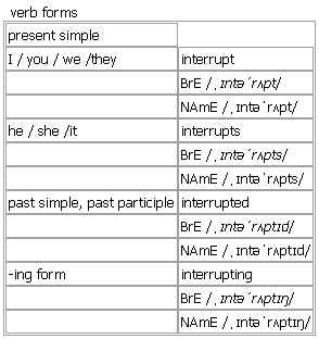 inter·rupt [interrupt interrupts interrupted interrupting] BrE [ˌɪntəˈrʌpt] NAmE [ˌɪntəˈrʌpt] verb 1. intransitive, transitive to say or do sth that makes sb stop what they are saying or doing • Sorry to interrupt, but there's someone to see you. •~ with sth Would you mind not interrupting with questions all the time? •~ sb/sth (with sth) I hope I'm not interrupting you. •They were interrupted by a knock at the door. •~ (sb) + speech ‘I have a question,’ she interrupted. 2. transitive ~ sth to stop sth for a short time • The game was interrupted several times by rain. • We interrupt this programme to bring you an important news bulletin. 3. transitive ~ sth to stop a line, surface, view, etc. from being even or continuous Verb forms: Word Origin: late Middle English: from Latin interrupt- ‘broken, interrupted’, from the verb interrumpere, from inter- ‘between’ + rumpere ‘to break’. Thesaurus: interrupt verb 1. I, T •Please stop interrupting me! disturb • • cut in • • barge in • |especially spoken bother • |informal chip in • |formal intrude • • trouble • interrupt/disturb sb/cut in/bother sb/chip in/trouble sb with sth be sorry to interrupt sb/disturb sb/cut in/bother sb/intrude/trouble sb Interrupt, disturb or bother? You usually interrupt sb who is speaking by speaking yourself. You can either disturb or bother sb who is trying to do sth on their own, by talking to them or asking questions. You can also disturb (but not bother or interrupt) sb who is trying to rest, by making a lot of noise. 2. T •The game was interrupted twice by rain. disrupt • • interfere with sth • • hold sb /sth back • • hamper • • hinder • • obstruct • • upset • interrupt/disrupt/interfere with/hamper/hinder/obstruct (sb's) work interrupt/disrupt a meeting Example Bank: •‘He's kidding,’ I interrupted hastily. •I didn't manage to finish the report. I kept getting interrupted. •I thought it better not to interrupt her with any comment. •I'm sorry to interrupt, but there's a telephone call for you. •It was all irrelevant, but I didn't dare interrupt him in mid-flow. •The morning's work was constantly interrupted by phone calls. •Their luncheon was brutally interrupted by gunfire. •What was I saying, before we were so rudely interrupted? •‘What's his name?’ John interrupted. •I hope I'm not interrupting you. •I've forgotten what you were saying, before we were so rudely interrupted. •Please stop interrupting all the time! •Sh! You're always interrupting me! •Sorry to interrupt your dinner. •They were interrupted by a knock on the door. •Transport services were constantly interrupted by air raids.
